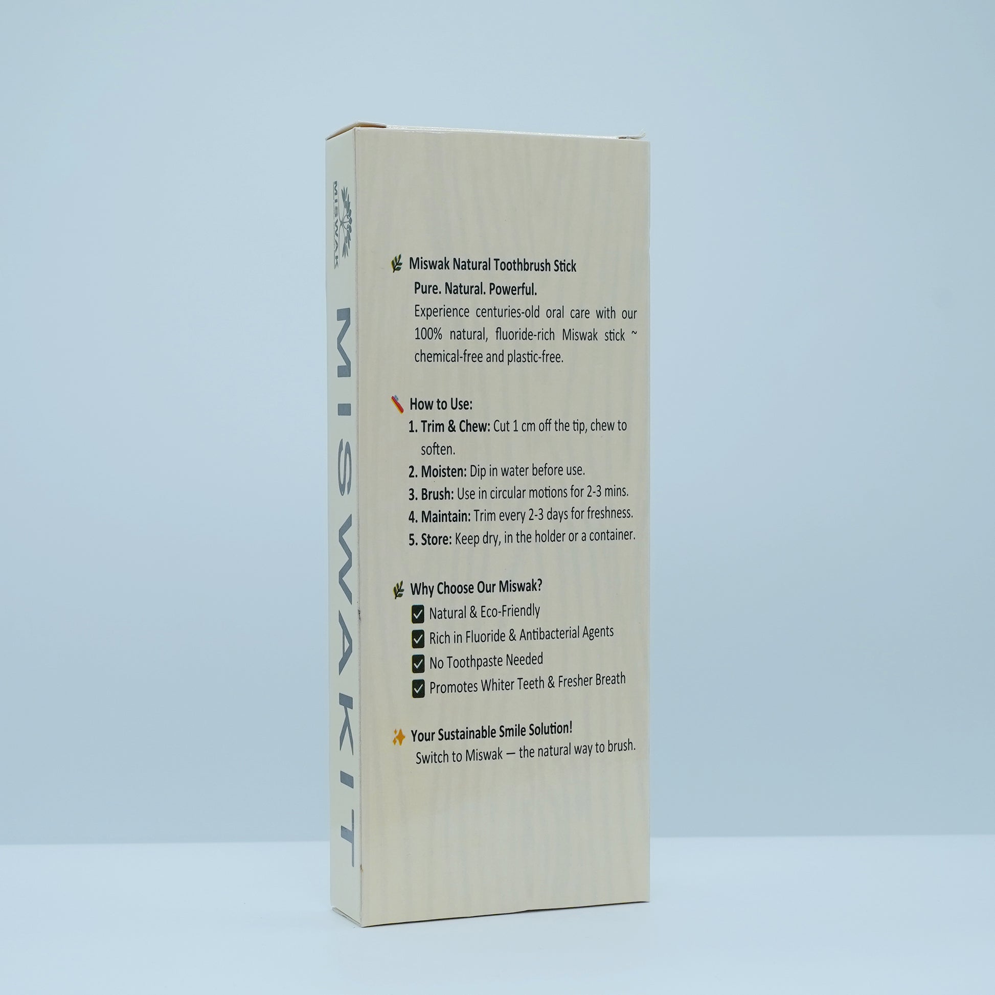 Experience the natural way of oral care with PureMiswak β harvested from premium Salvadora Persica trees. Each stick is packed with goodness to keep your teeth strong, gums healthy, and breath naturally fresh.